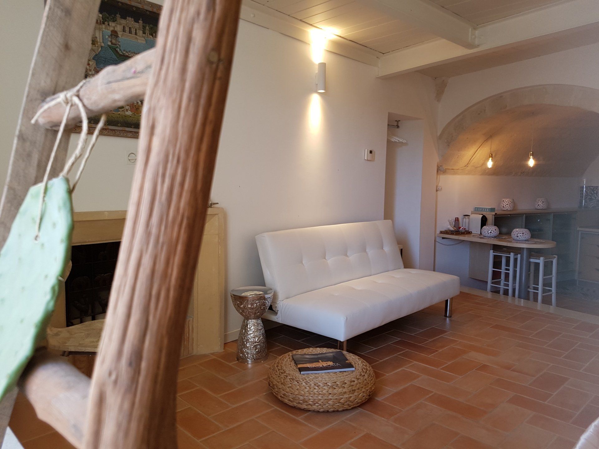 Gli arredi sono contemporanei e di design, che ben si armonizzano con le architetture rupestri incluso il bellissimo caminetto .