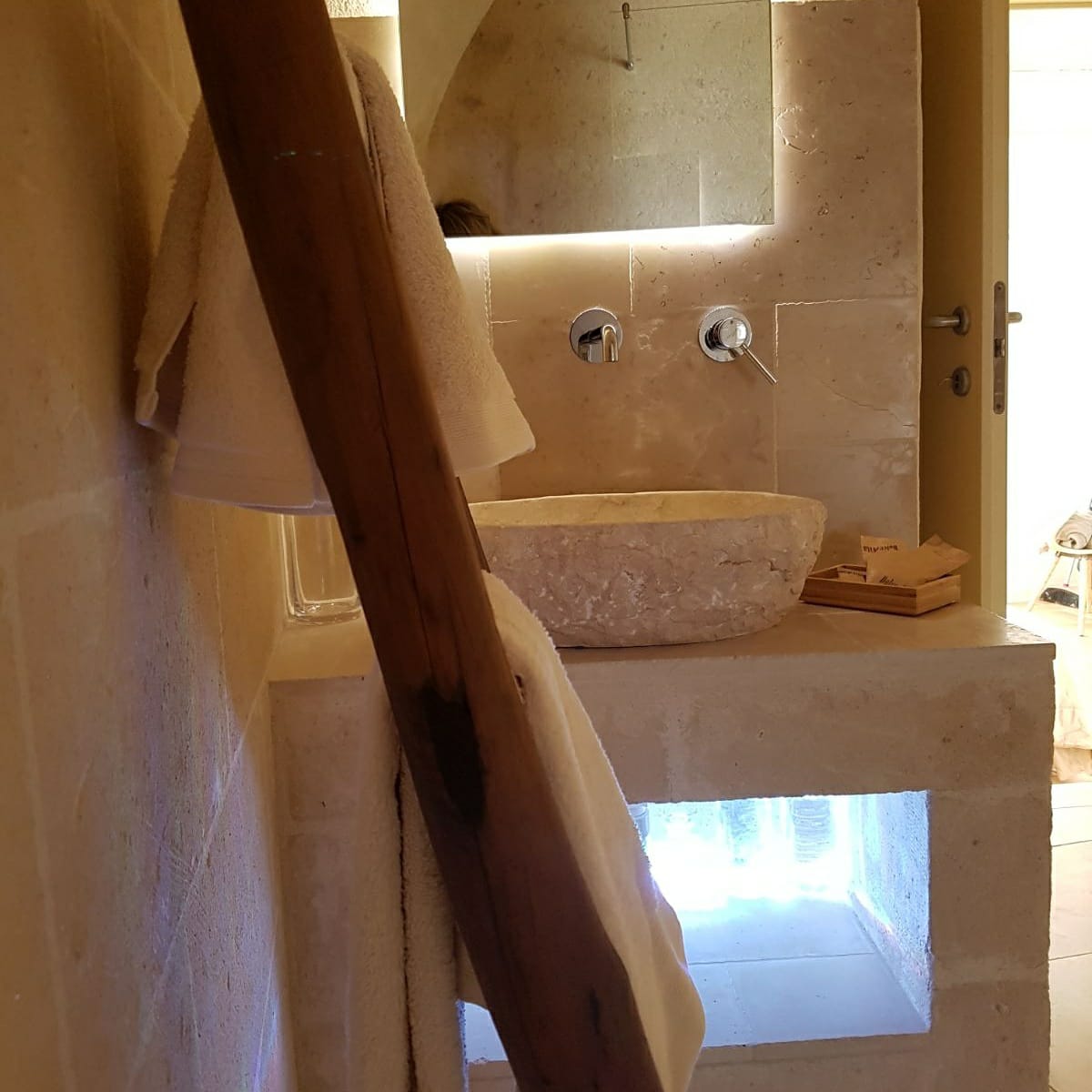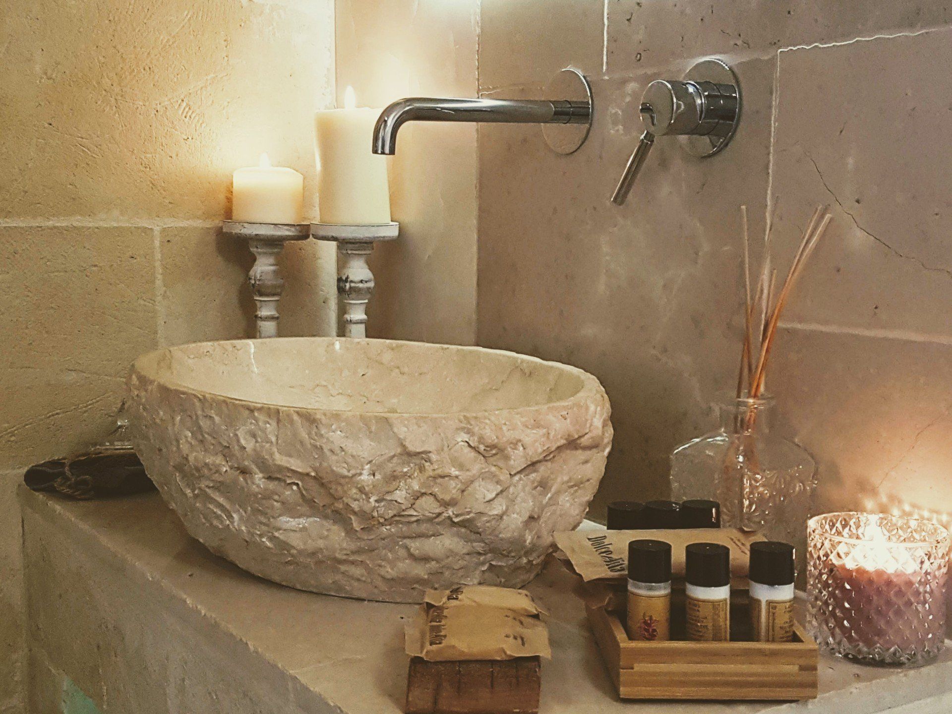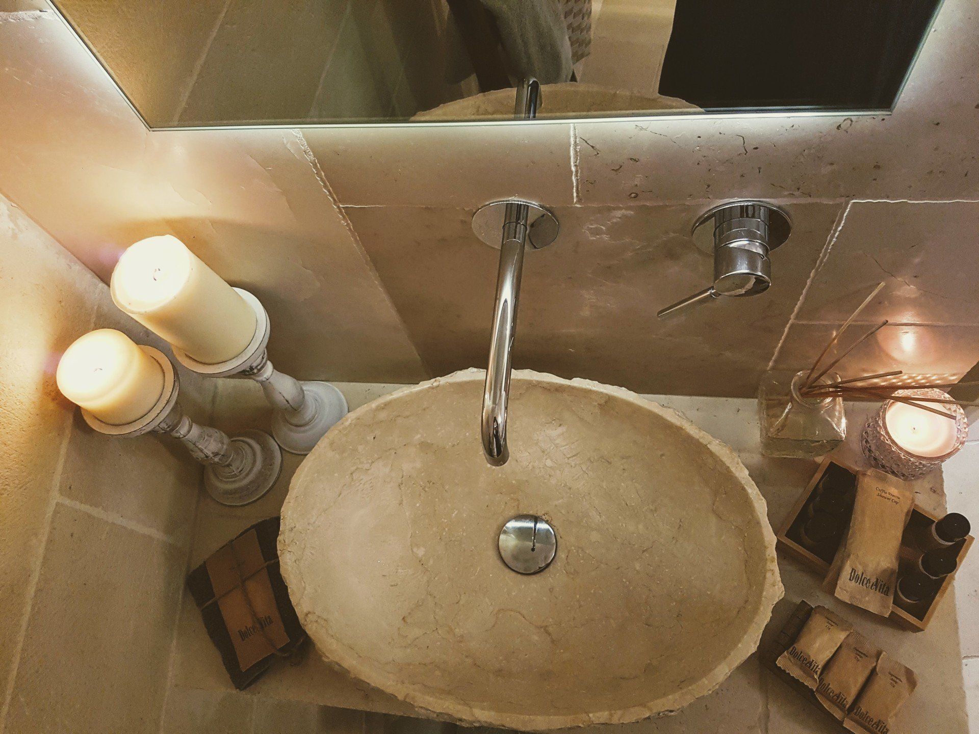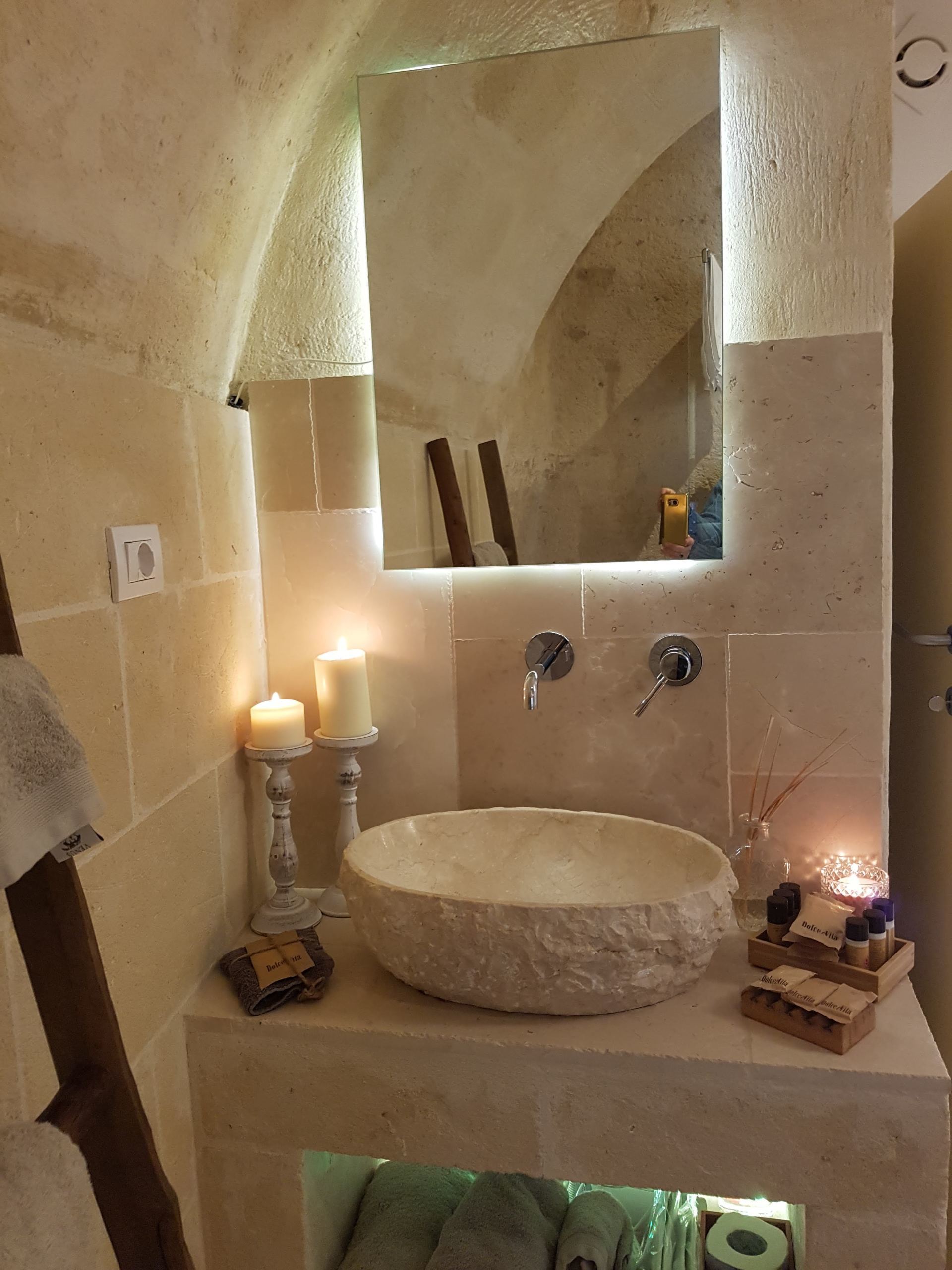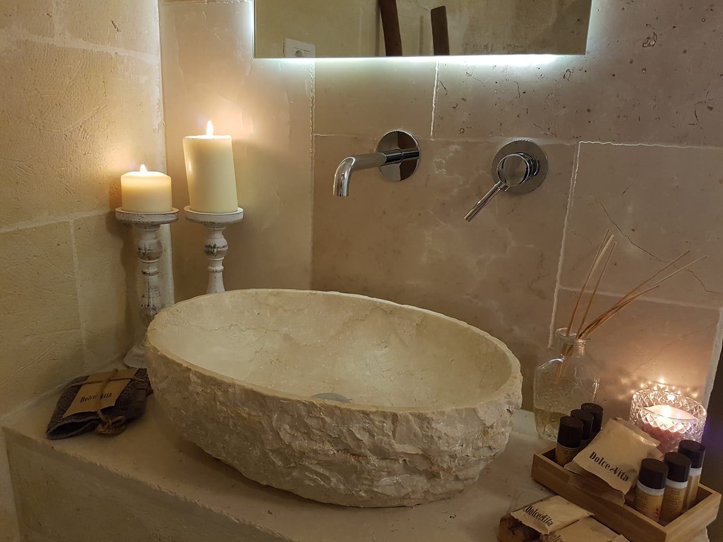 Il bagno completamente ipogeo, dispone di una doccia in cristallo molto ampia, è comodo e suggestivo.